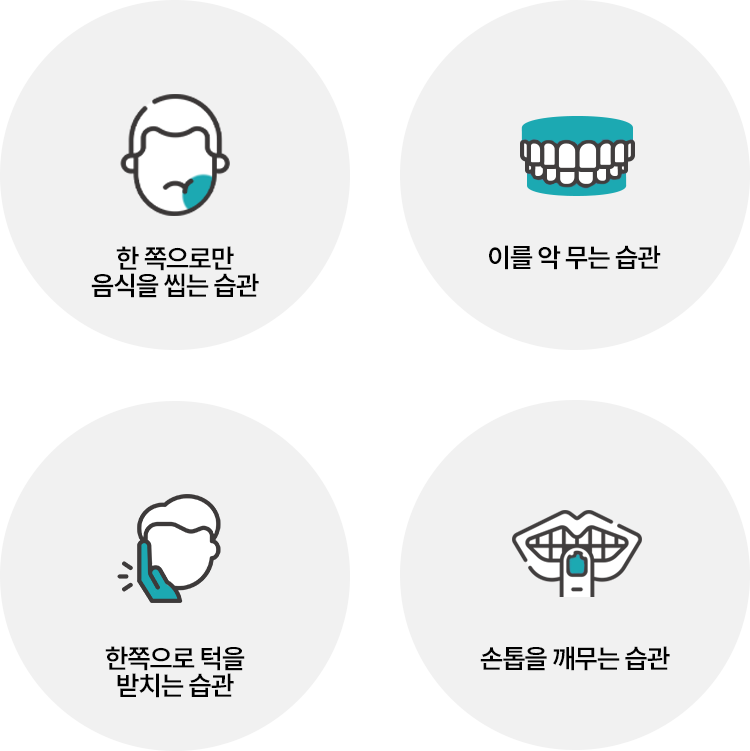 턱을 무리하게 사용하는 것, 즉 구강 악습관이 가장 중요한 원인으로 작용합니다.
